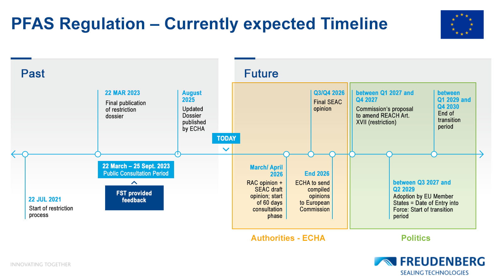 Freudenberg Sealing Technologies has also participated in the stakeholder consultation and actively engaged in relevant industry associations. We fully support the goals of the European Green Deal and the Chemicals Strategy for Sustainability to improve protection of human health and the environment from risks posed by chemicals and we advocate for a responsible, differentiated and risk-based approach to regulate PFAS. More details on our statement on the EU PFAS restriction proposal are available at https://echa.europa.eu/restrictions-under-consideration/-/substance-rev/72301/term